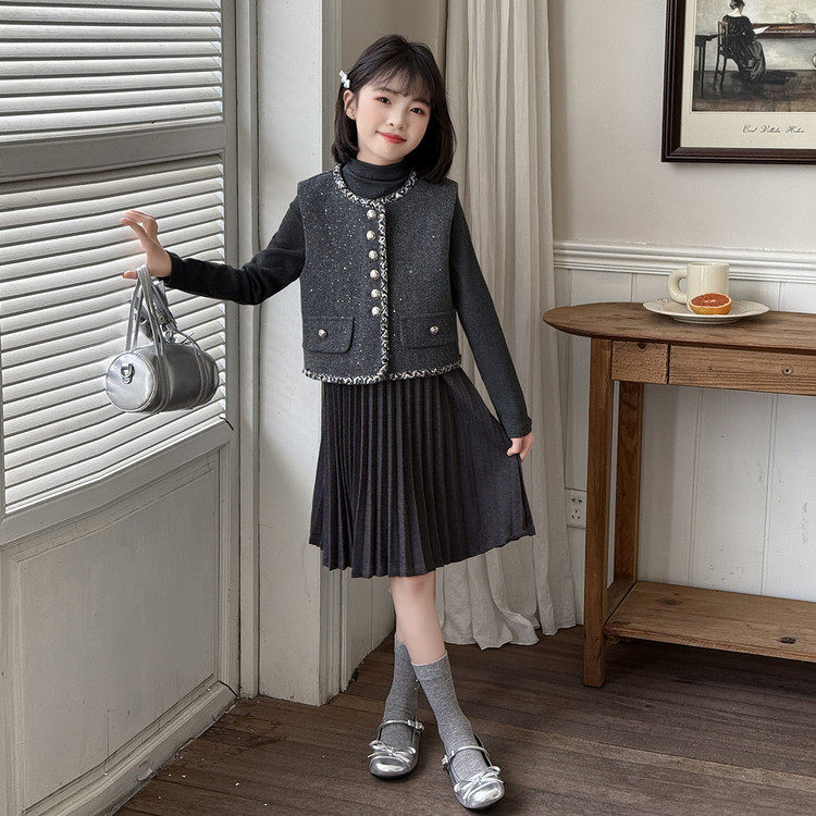 女童套装长袖百褶裙春秋款毛呢马甲2025新款连衣裙小香风洋气时尚