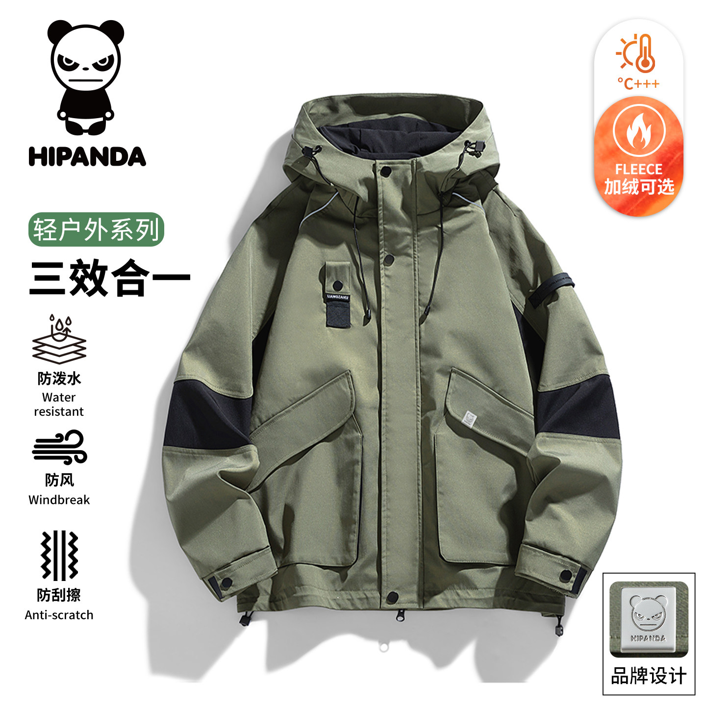 Hipanda你好熊猫秋冬季夹克男士加绒加厚保暖连帽冲锋衣外套GH