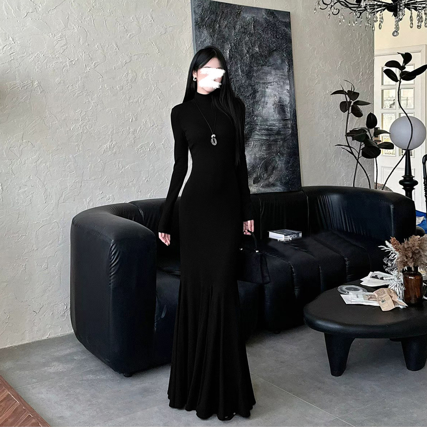 步步生莲鱼尾连衣裙女黑色紧身针织长袖长款裙子秋冬季加厚小个子