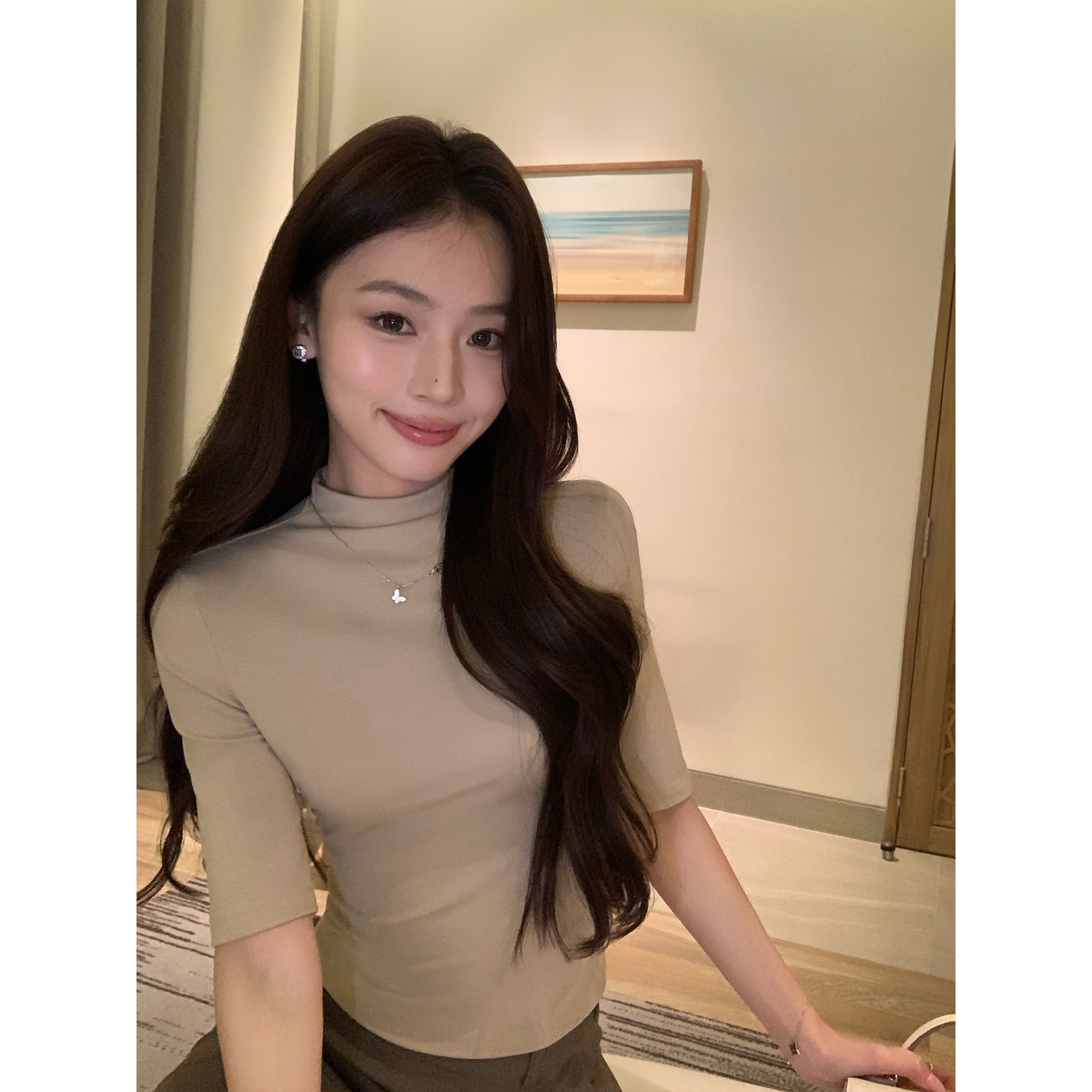 pusumede 简约百搭 半高领中袖T恤女气质修身短款半袖针织上衣