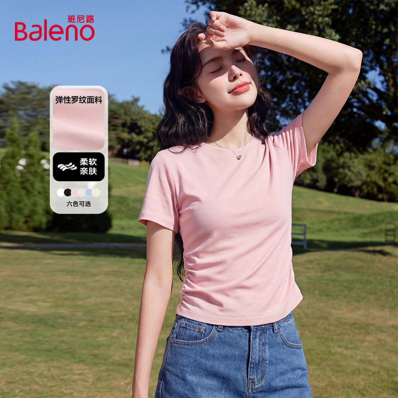 班尼路圆领正肩短袖T恤女春夏新款抽褶收腰修身显瘦短款半袖上衣N
