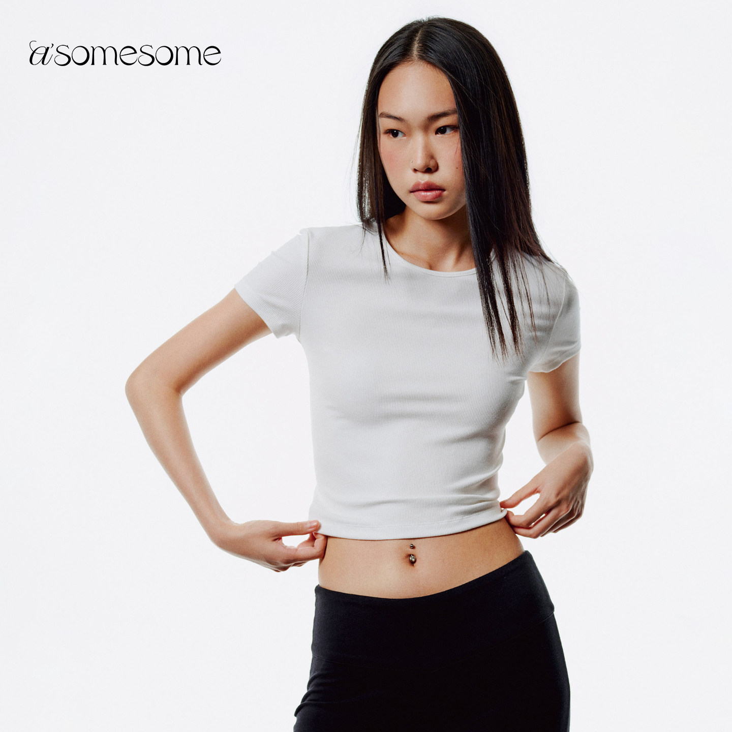 asomesome白色修身正肩短袖t恤女短款紧身圆领运动半袖打底上衣