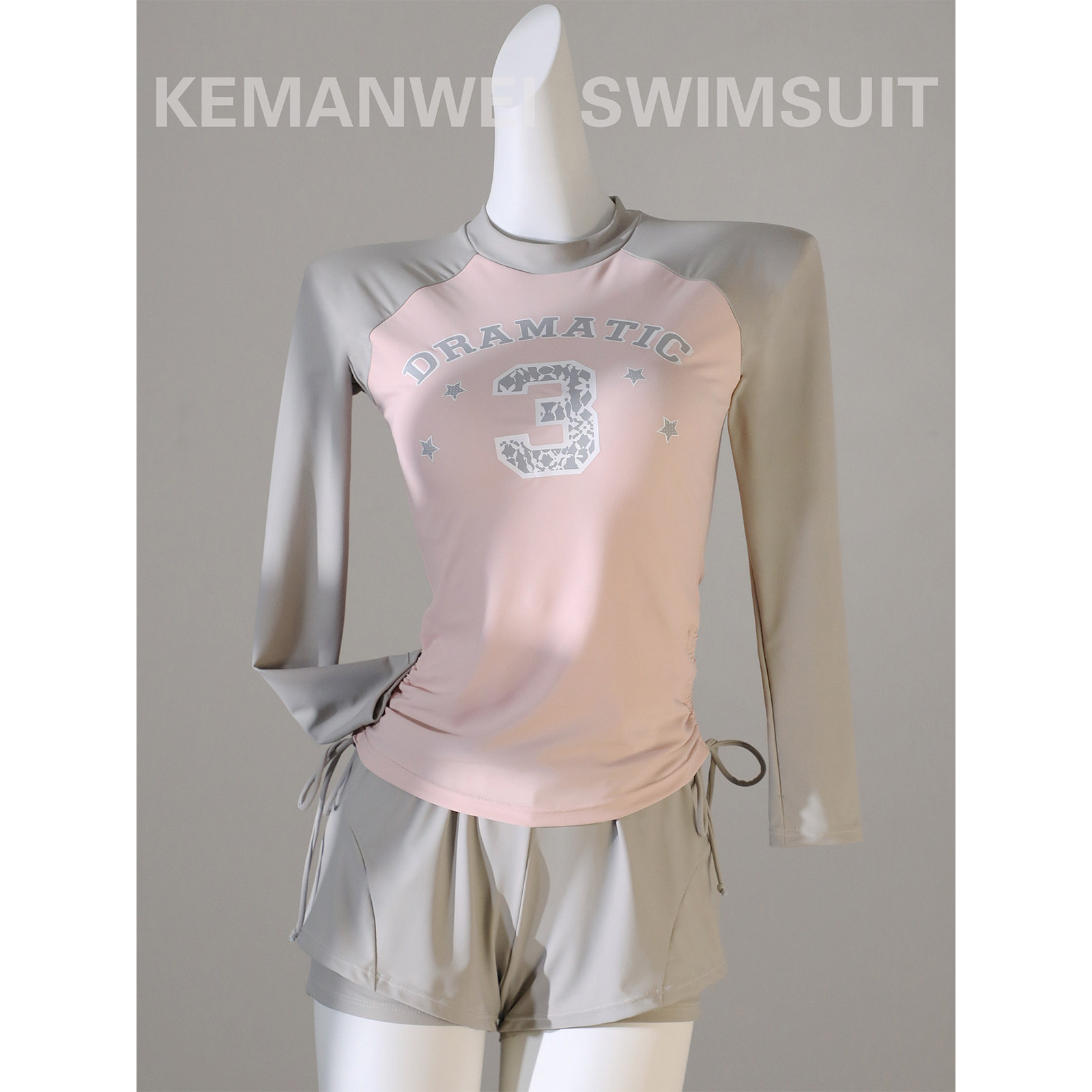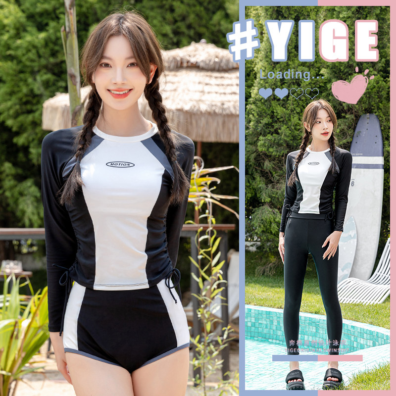 长袖防晒分体平角裤保守运动三件套小胸聚拢冲浪泡温泉度假泳衣女
