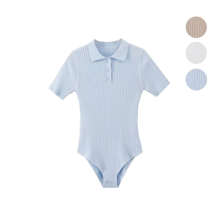 复古针织螺纹polo衫短袖女装套头夏季新翻领T恤chic修身连体衣潮
