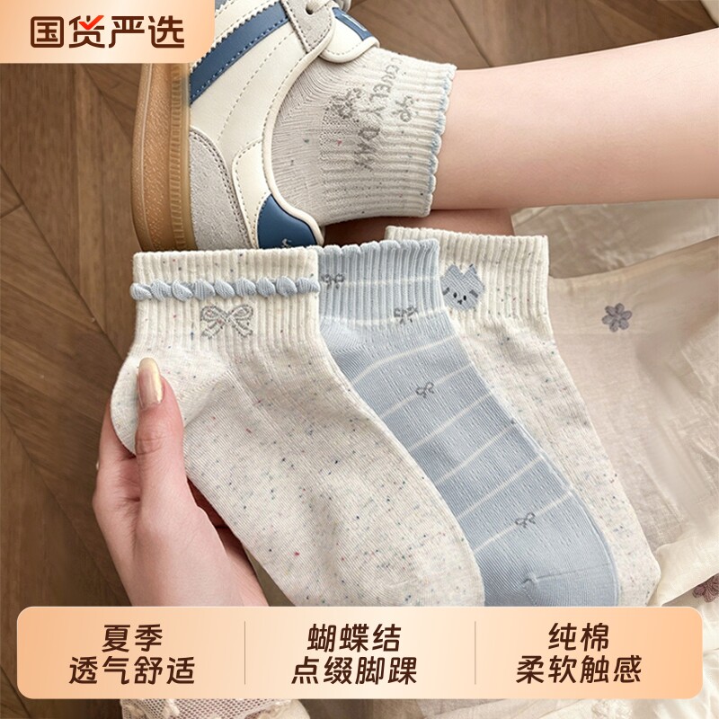 蓝色蝴蝶结点子纱袜子女春夏薄款纯棉短袜ins潮日系学院风中筒袜