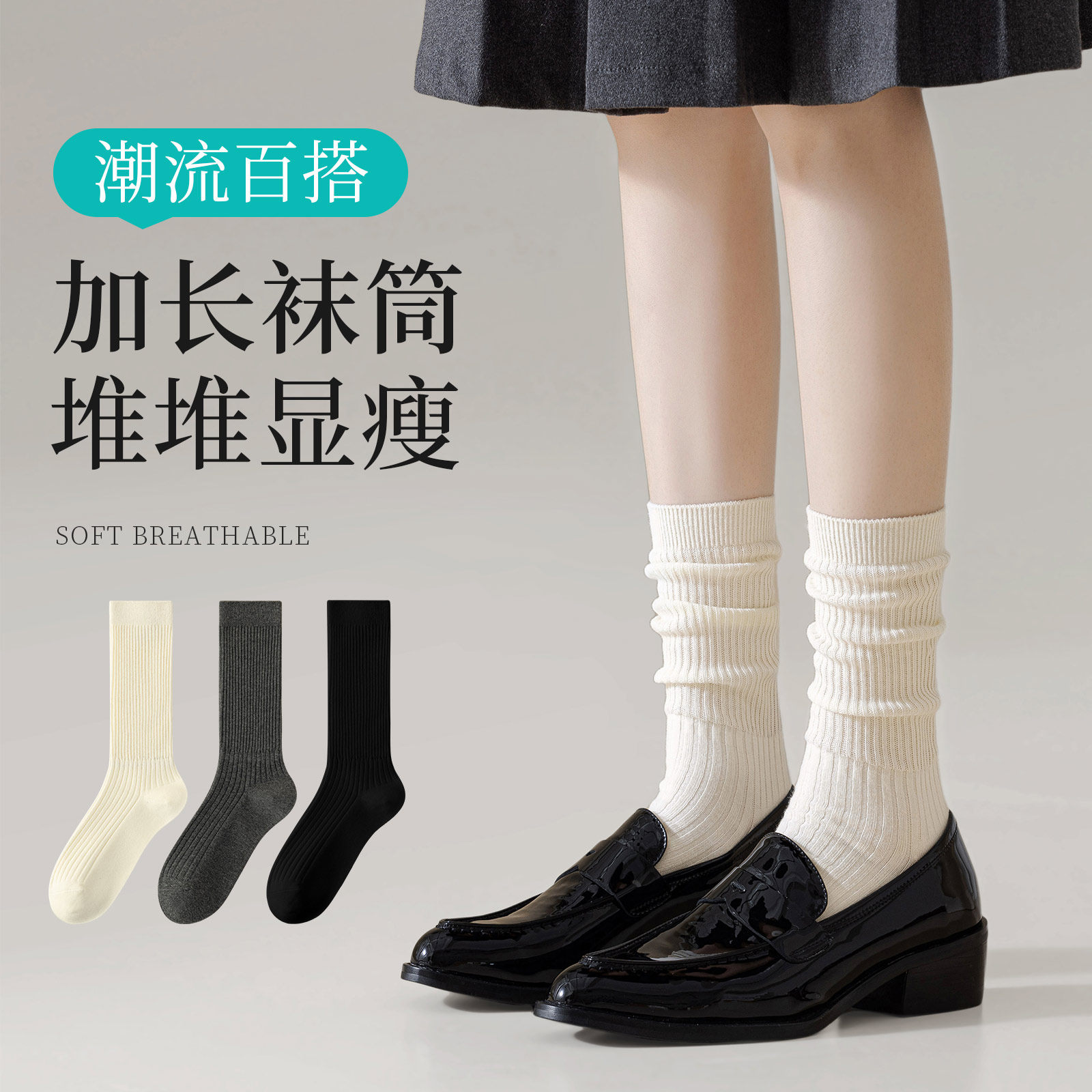 白色堆堆袜子女中筒纯色ins潮春秋款袜简约黑色夏季薄款月子长袜