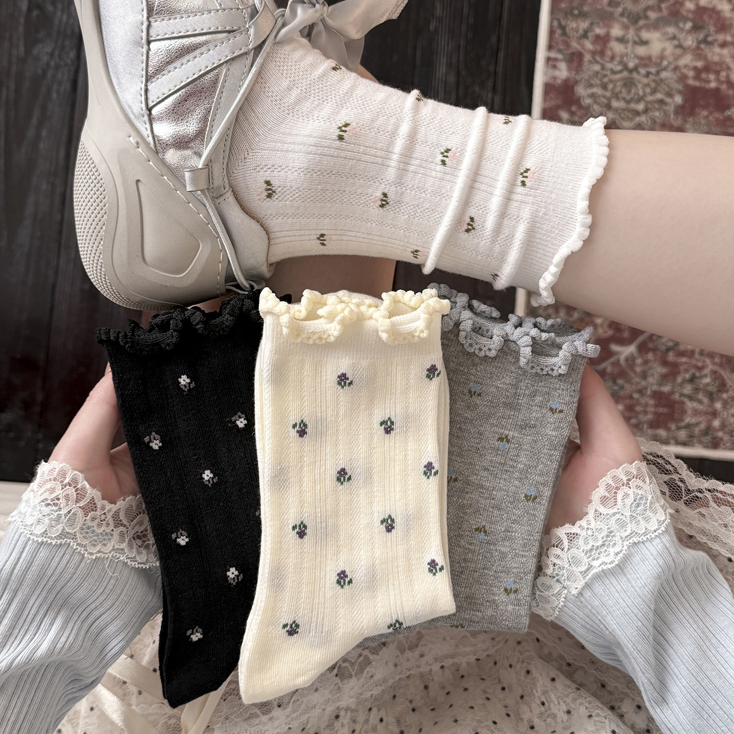 木耳花边小碎花中筒袜ins潮2026春夏款透气miu风日系堆堆袜夏天