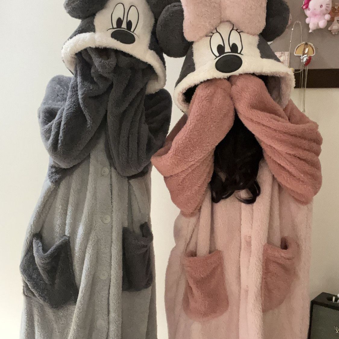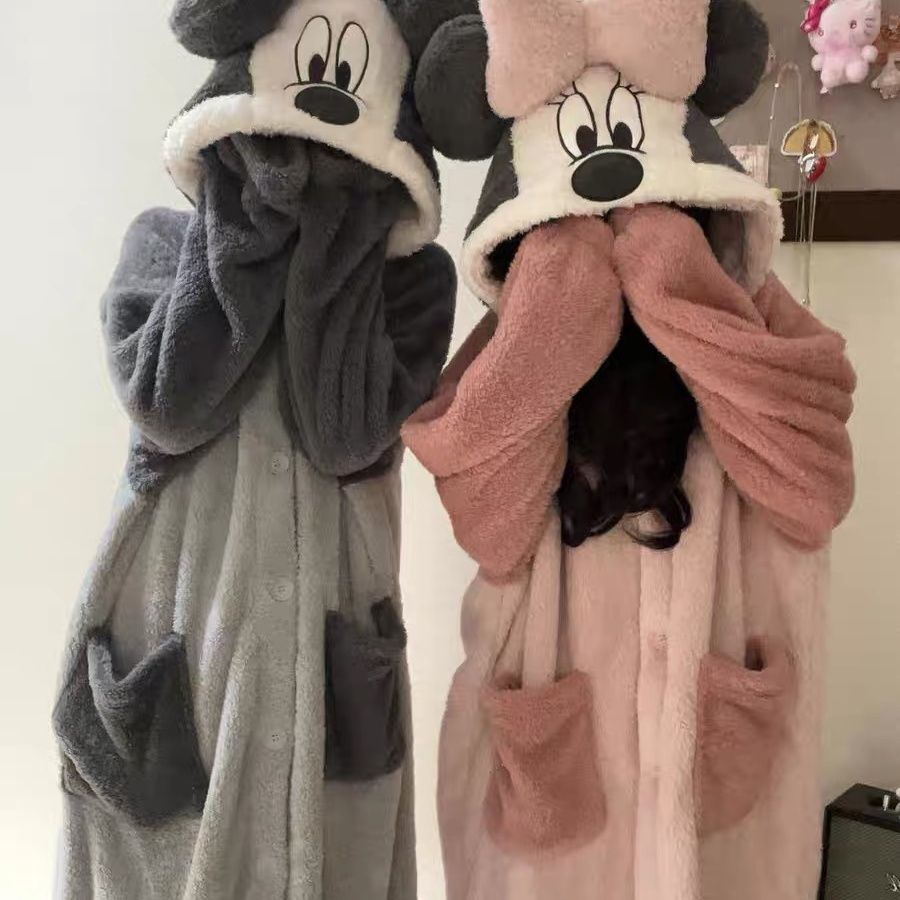 情侣米奇米妮连帽睡袍女珊瑚绒加绒加厚睡衣男卡通可爱家居服套装