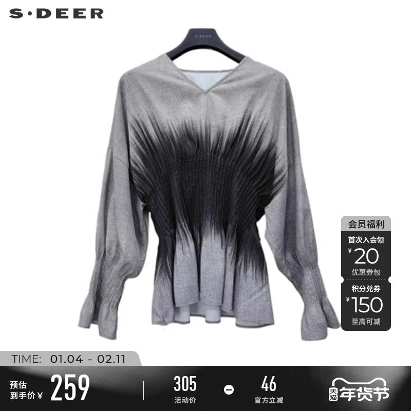 sdeer圣迪奥女装OL风V领压褶印花不规则衬衫S241Z0519