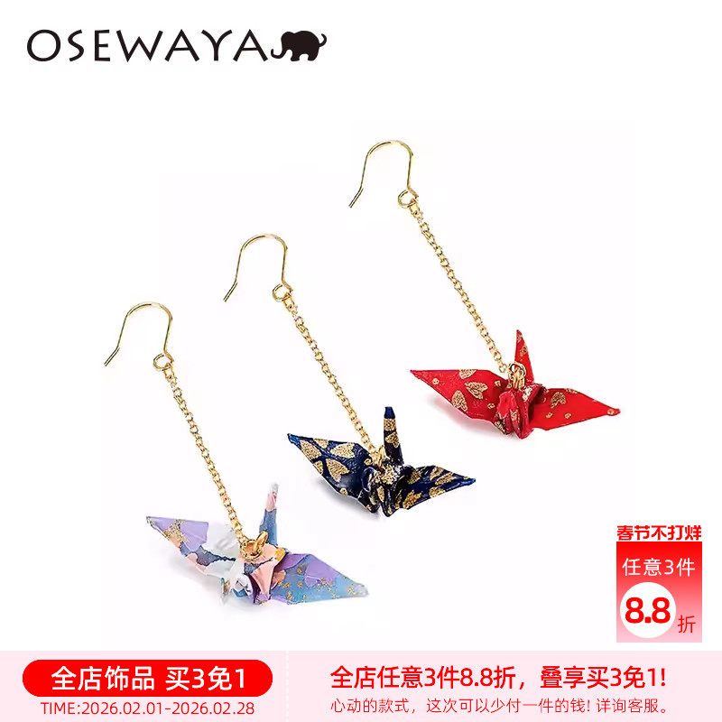 OSEWAYA耳环千纸鹤耳夹女无耳洞和风耳钉小众设计长新年红色耳饰