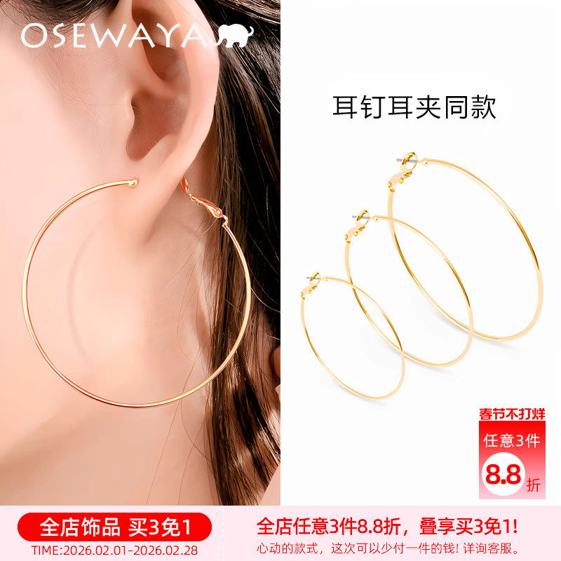 OSEWAYA耳圈925银针大圆圈耳环夸张金色圆环耳夹无耳洞素圈耳饰女