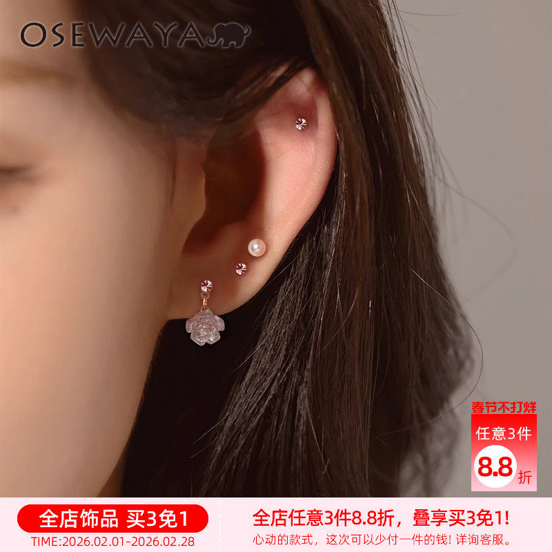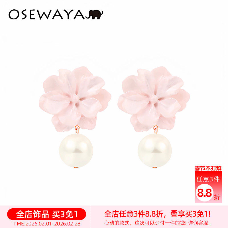osewaya耳环花朵耳钉女气质耳夹珍珠耳坠粉色贝母无耳洞耳饰春夏
