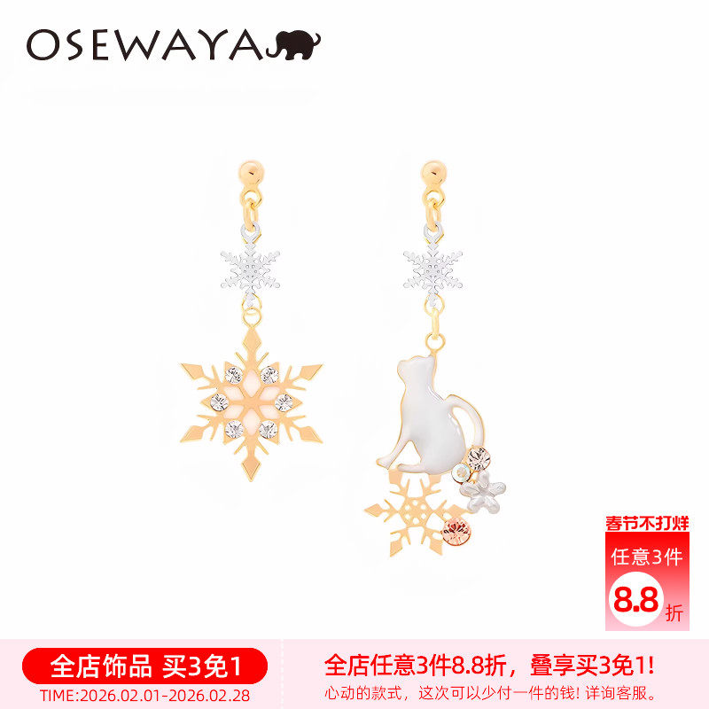 OSEWAYA耳钉可爱甜美不对称雪花猫咪无耳洞耳夹少女俏皮灵动耳饰