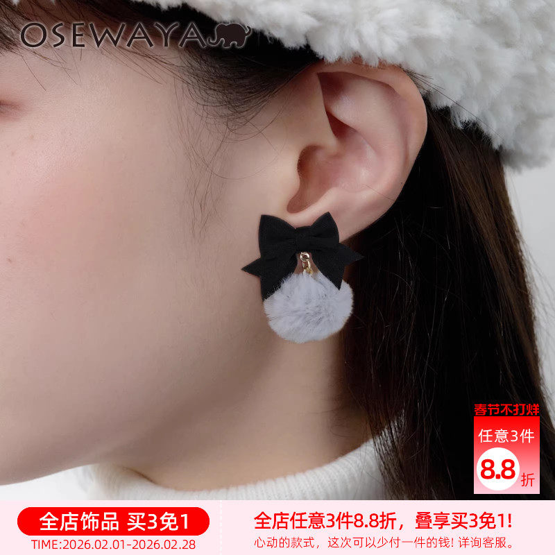 OSEWAYA耳夹蝴蝶结毛绒气质无耳洞耳饰可爱毛球秋冬新款甜酷耳钉