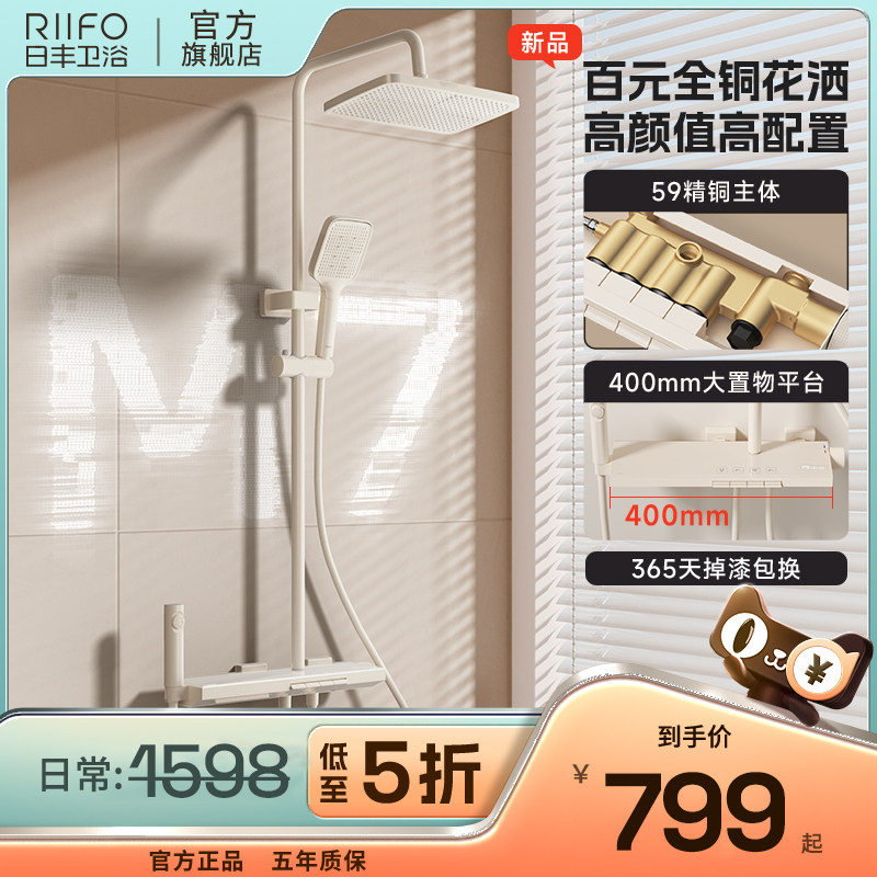 日丰M7奶油风白色淋浴花洒套装全铜家用增压沐浴器钢琴键花洒套装