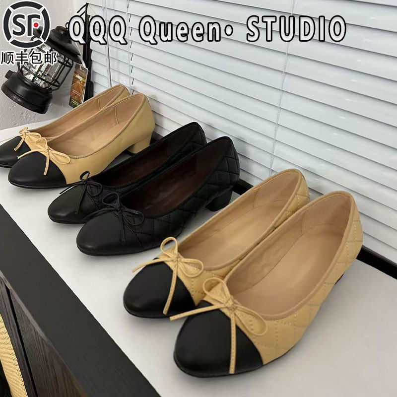 CDF女鞋轻奢秋季新款百搭真皮拼接法式蝴蝶结圆头平底鞋浅口单鞋
