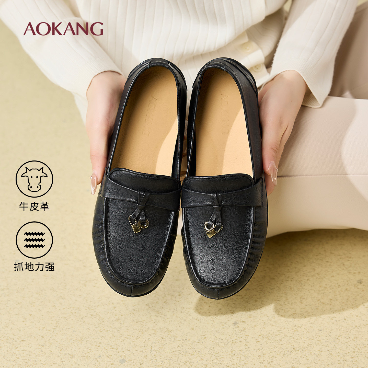 珀莱丽2025新款真皮加绒女鞋休闲舒适圆头平底鞋时尚百搭豆豆鞋