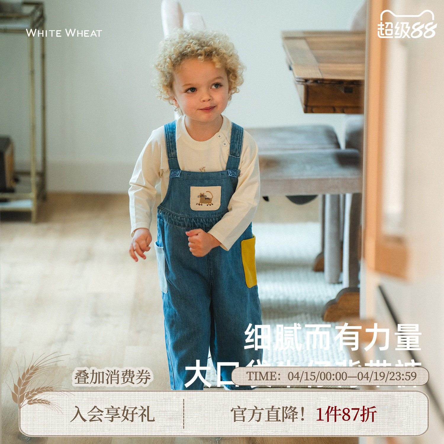 whitewheat儿童26春季新款裤子男女童卡通长裤宝宝纯棉牛仔背带裤