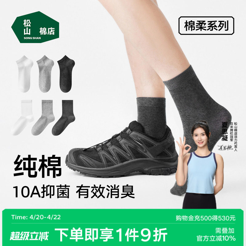 松山棉店黑白灰纯棉袜子男女抗菌防臭吸汗短袜中筒袜春夏薄款运动