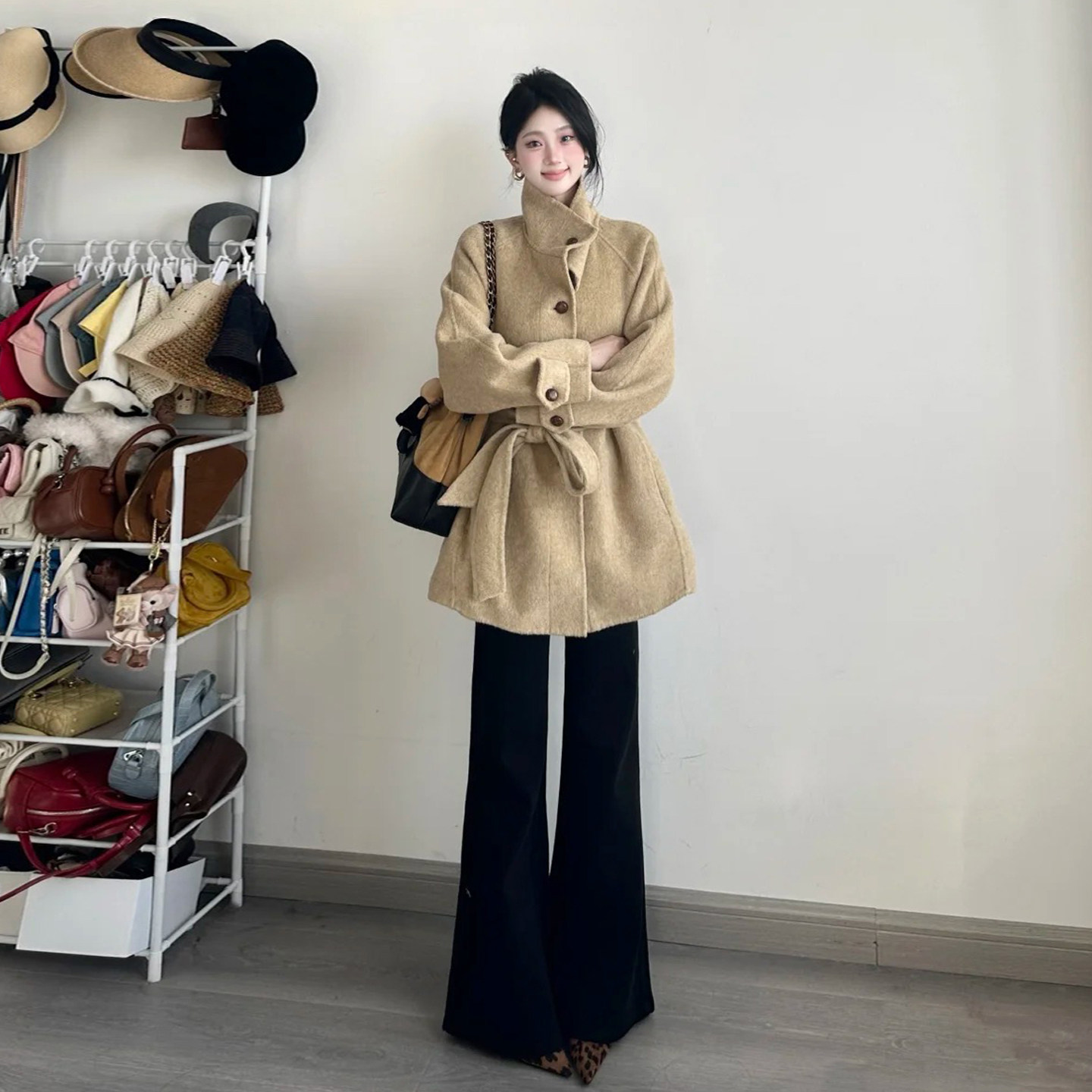 高级感复古卡其色立领毛呢外套女秋冬韩系小个子收腰短款呢子大衣