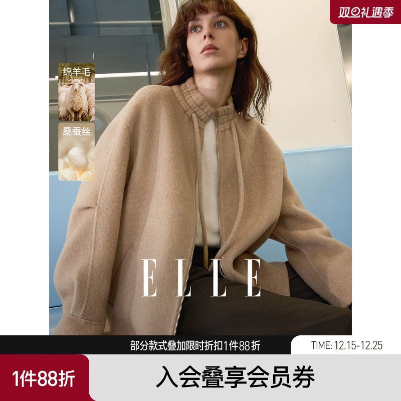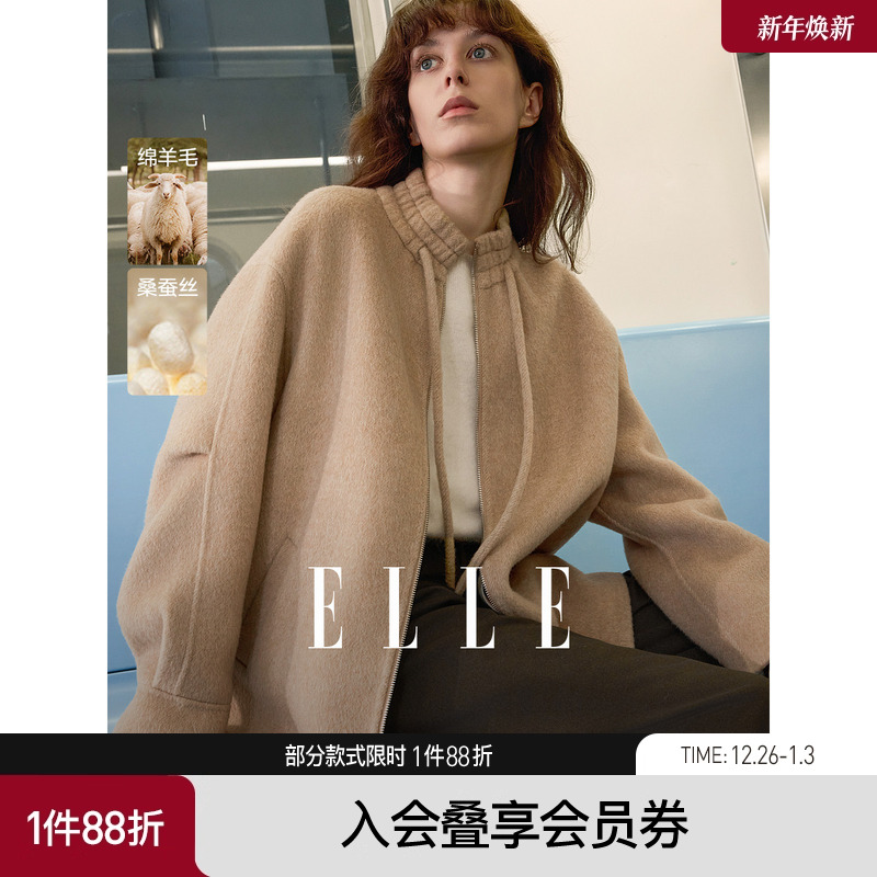 ELLE卡其色绵羊毛休闲毛呢外套女2025冬季新款立领宽松双面呢大衣