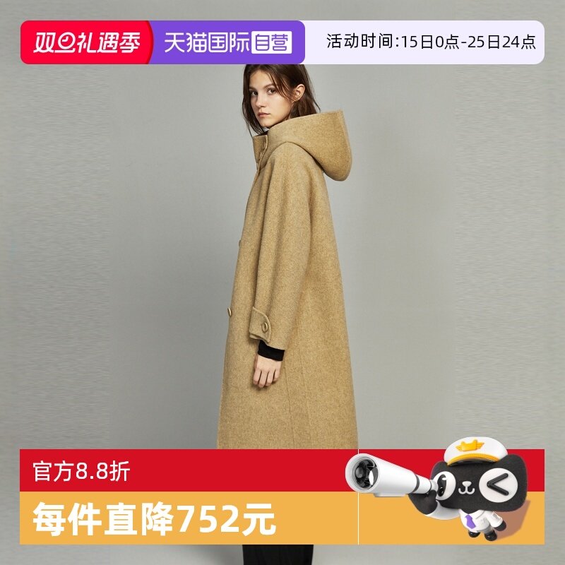 【自营】ELLE卡其色连帽毛呢外套女2024冬装新款中长款双面呢大衣