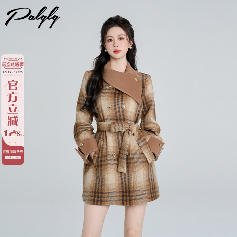 卡其色富家千金风格子毛呢外套女冬季高级感法式收腰漂亮流行大衣