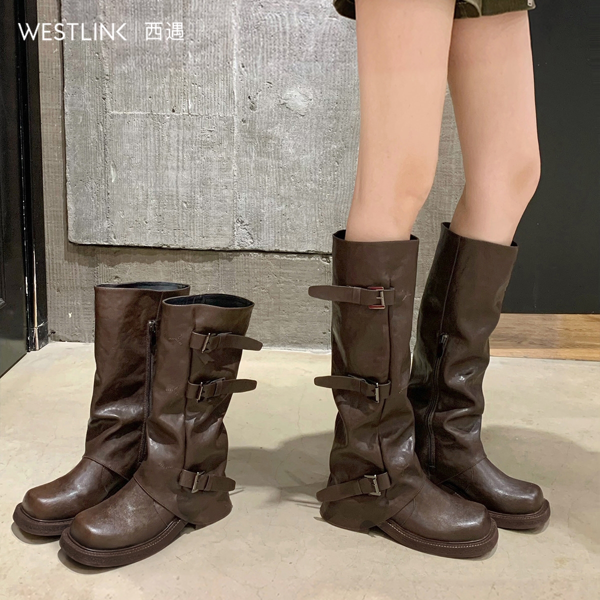 西遇复古厚底裤管靴女2025新款美拉德长筒靴褶皱堆堆靴骑士长靴TQ