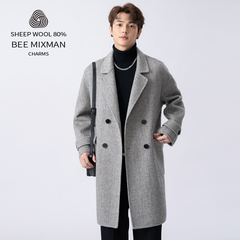 清爽简约~羊毛双面呢子大衣格子纹中长款西装领风衣外套男装Q101