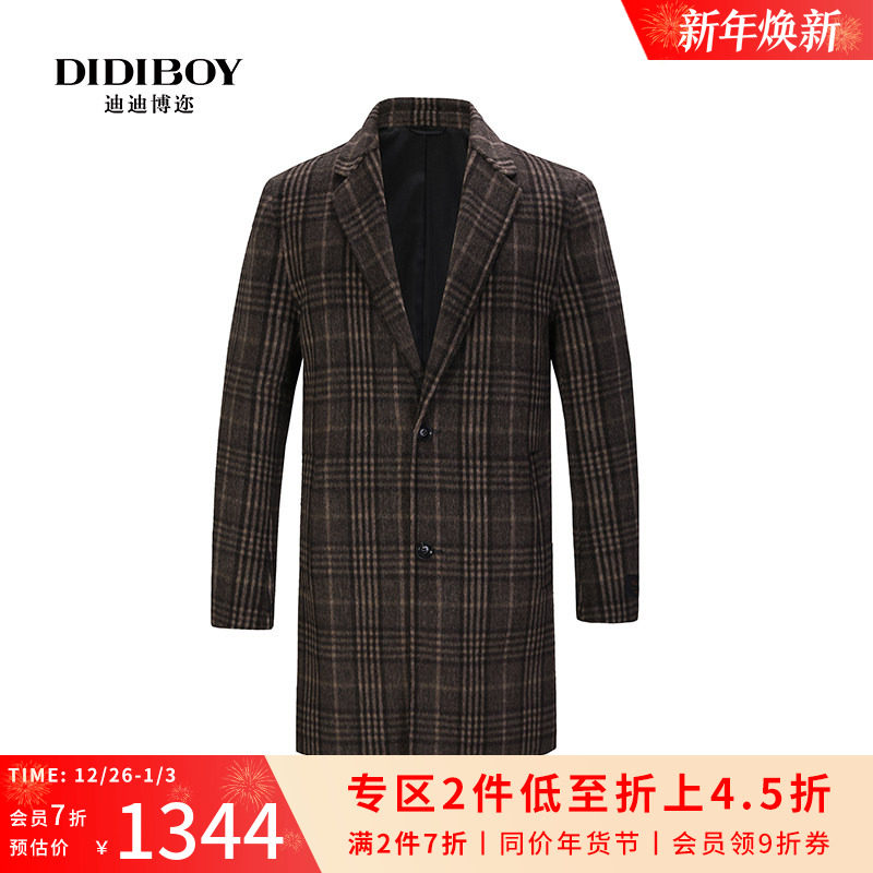 DIDIBOY冬季格子羊毛呢子大衣男士商务平驳领中长款保暖男装外套