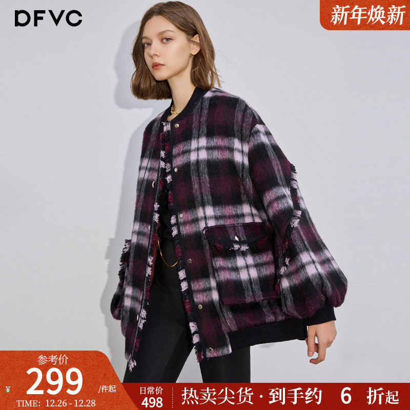 dfvc韩版格子羊毛呢外套女2025年冬季新款宽松休闲棒球服呢子大衣