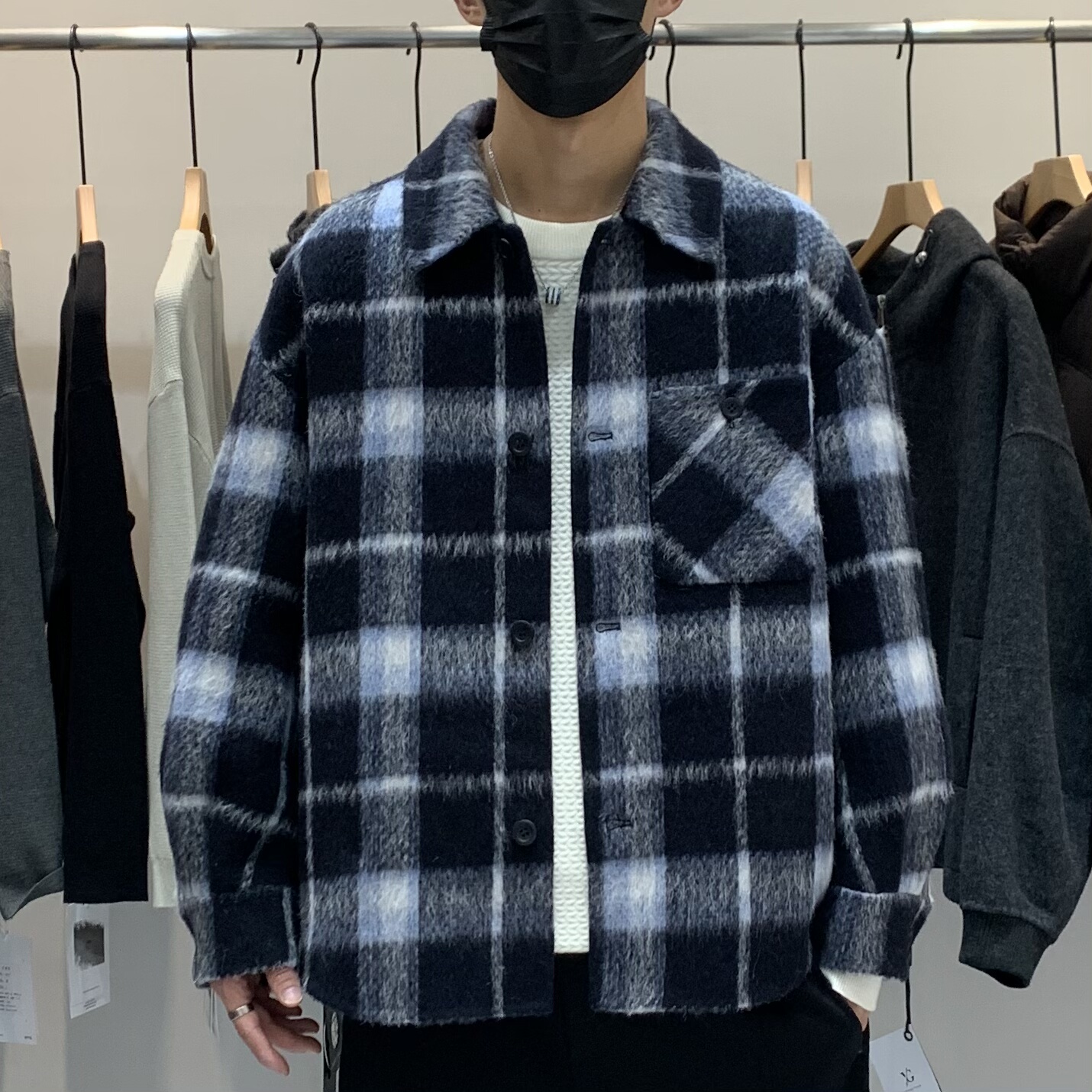 2025秋冬韩系拼色格子双面呢大衣男痞帅宽松休闲羊毛呢子外套潮