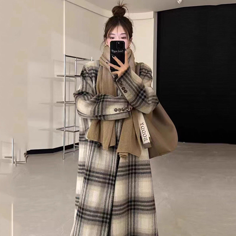 韩国东大门复古格子双面羊毛呢子大衣外套女中长款2025秋冬季新款