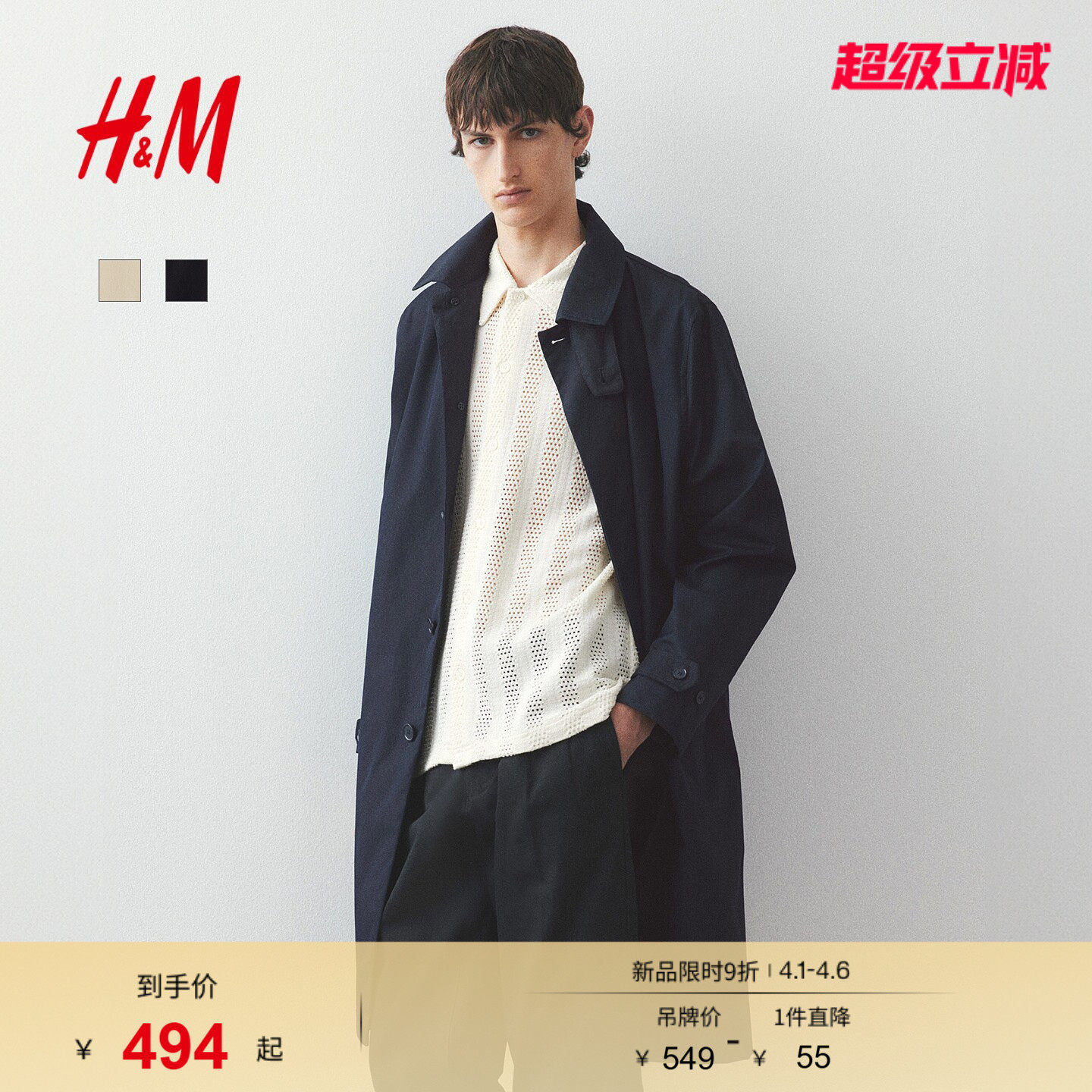 HM男装风衣法式通勤外套外出轻便舒适翻领中长款时尚大衣1262251
