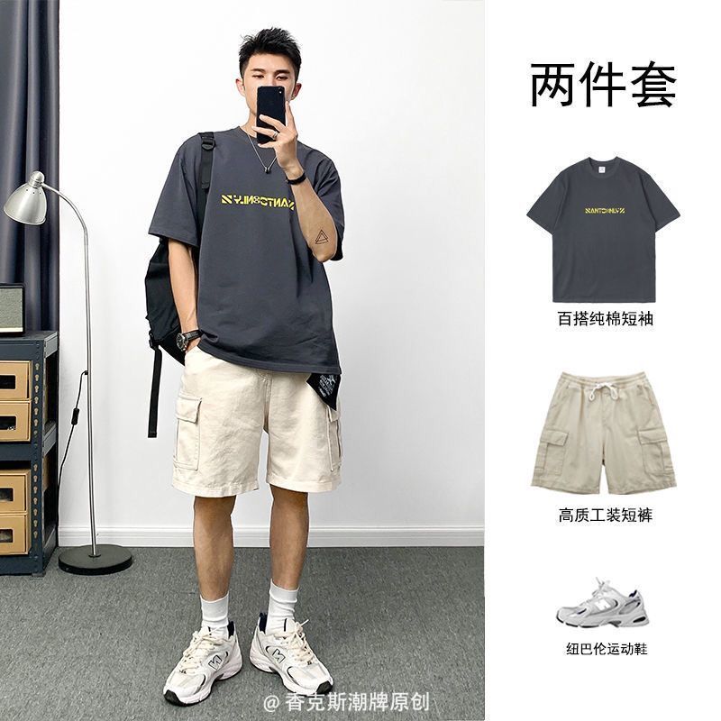 两件套工装短裤夏装男套装夏季潮休闲纯棉T恤男宽松一整套五分裤