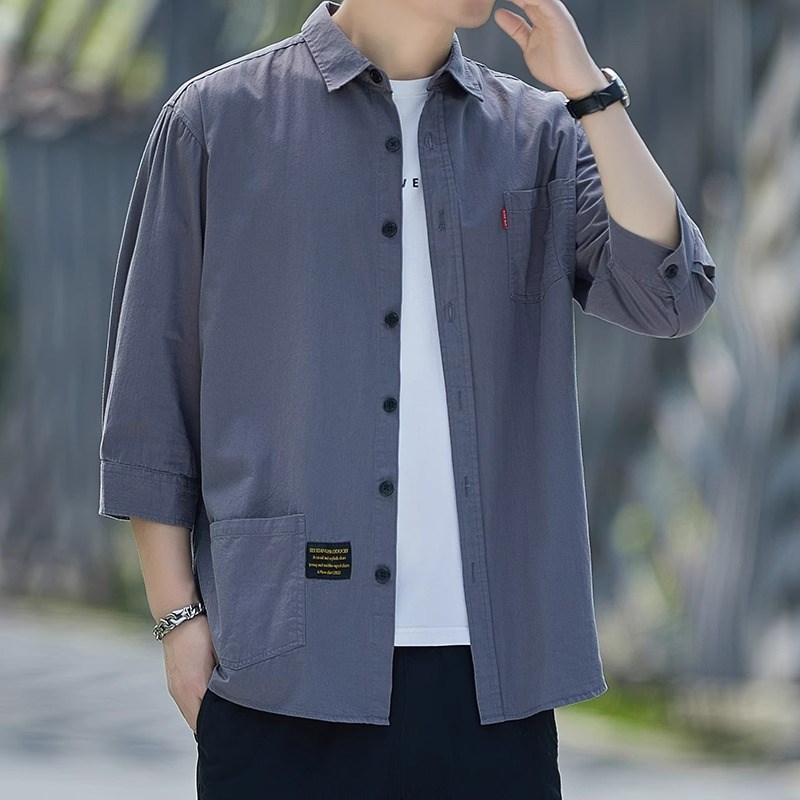 男士七分袖衬衫夏季纯棉短袖夏装男工作服五分袖衬衣男装休闲外套
