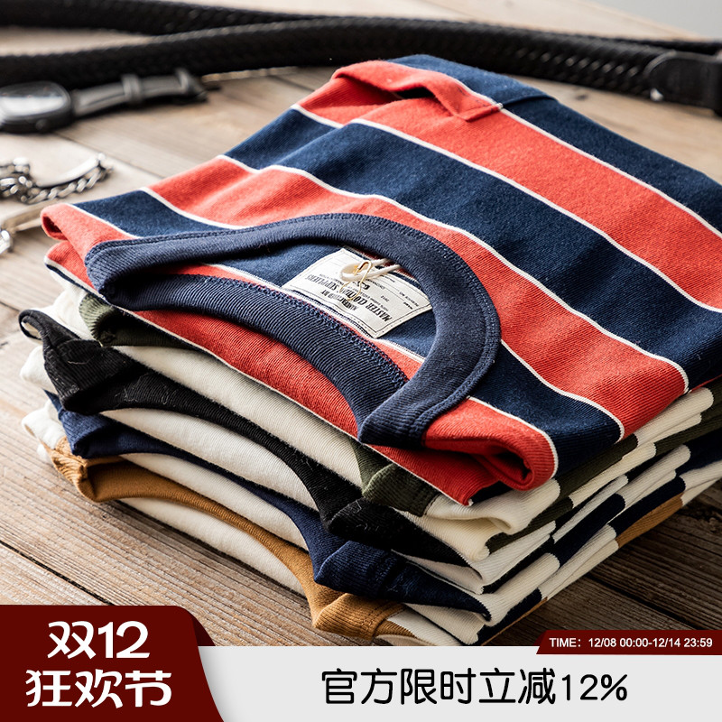 三本针280G重磅克重美式复古宽松条纹T恤 夏装男士时尚休闲短袖潮