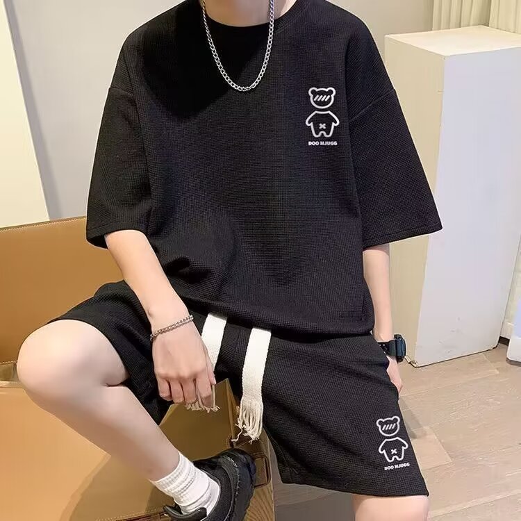 夏季华夫格短袖短裤套装男大码宽松夏装男士休闲男生穿搭一套薄款