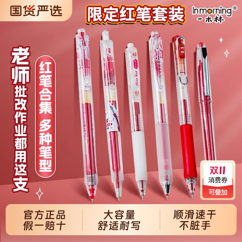 一木林红色按动中性笔套装简约高颜值红笔学生订正改错专用老师批改作业大容量水笔速干顺滑多种双珠书写教师
