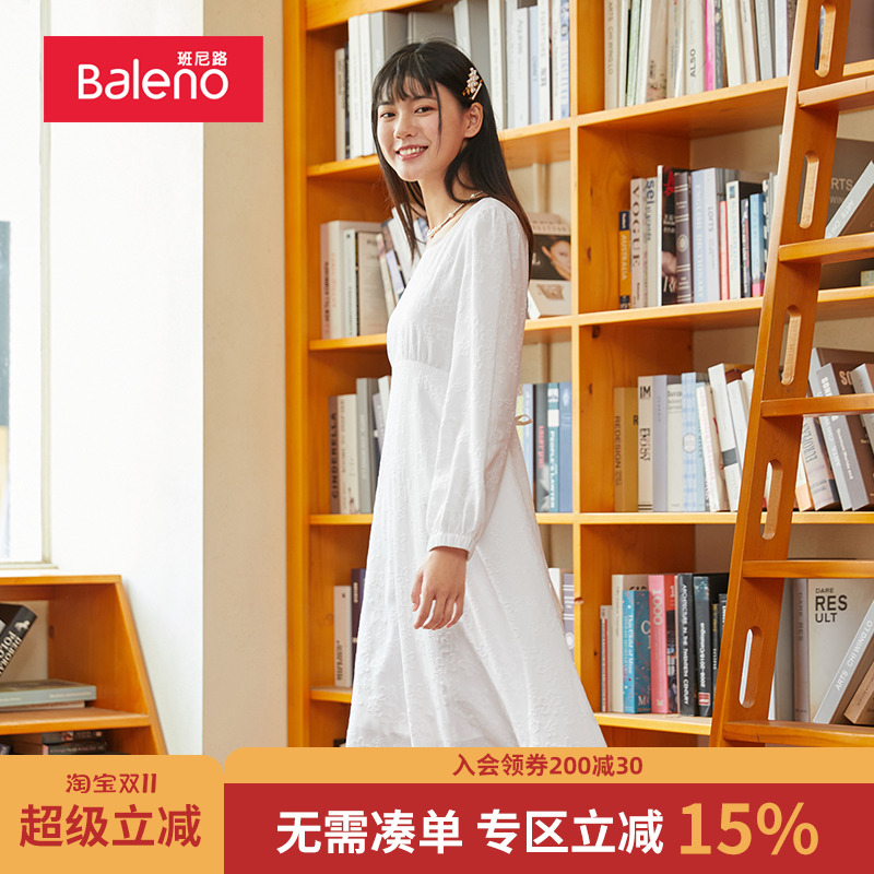 班尼路秋季新款日系复古休闲连衣裙白色圆领长袖女柔软雪纺中长裙