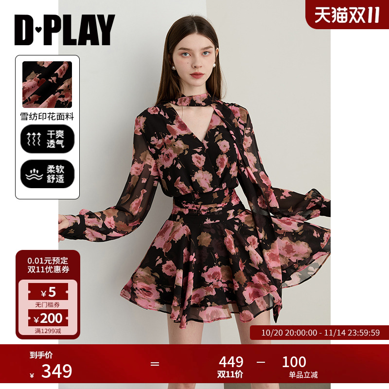 DPLAY2025年秋季新款黑色连衣裙女长款气质法式长袖雪纺印花裙子
