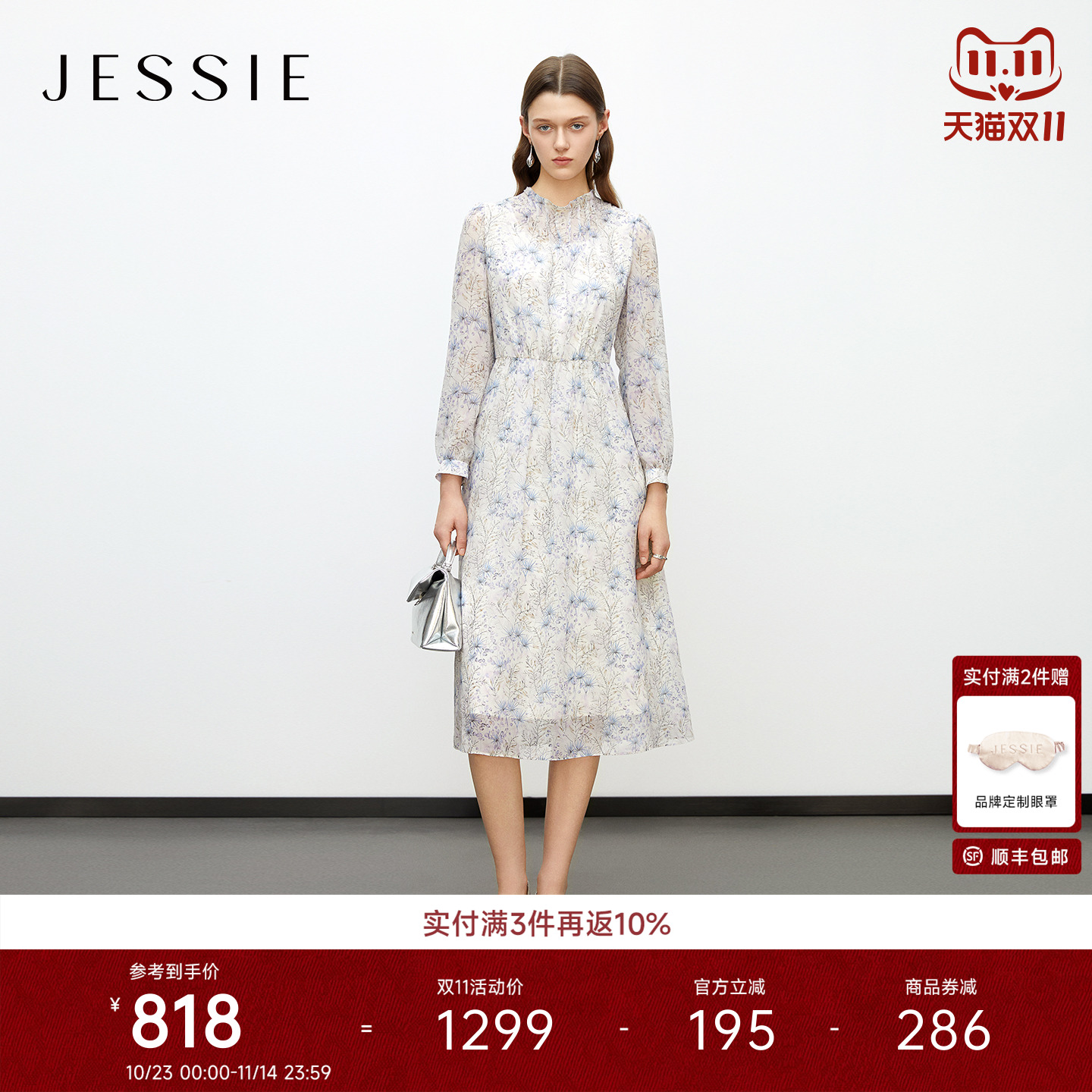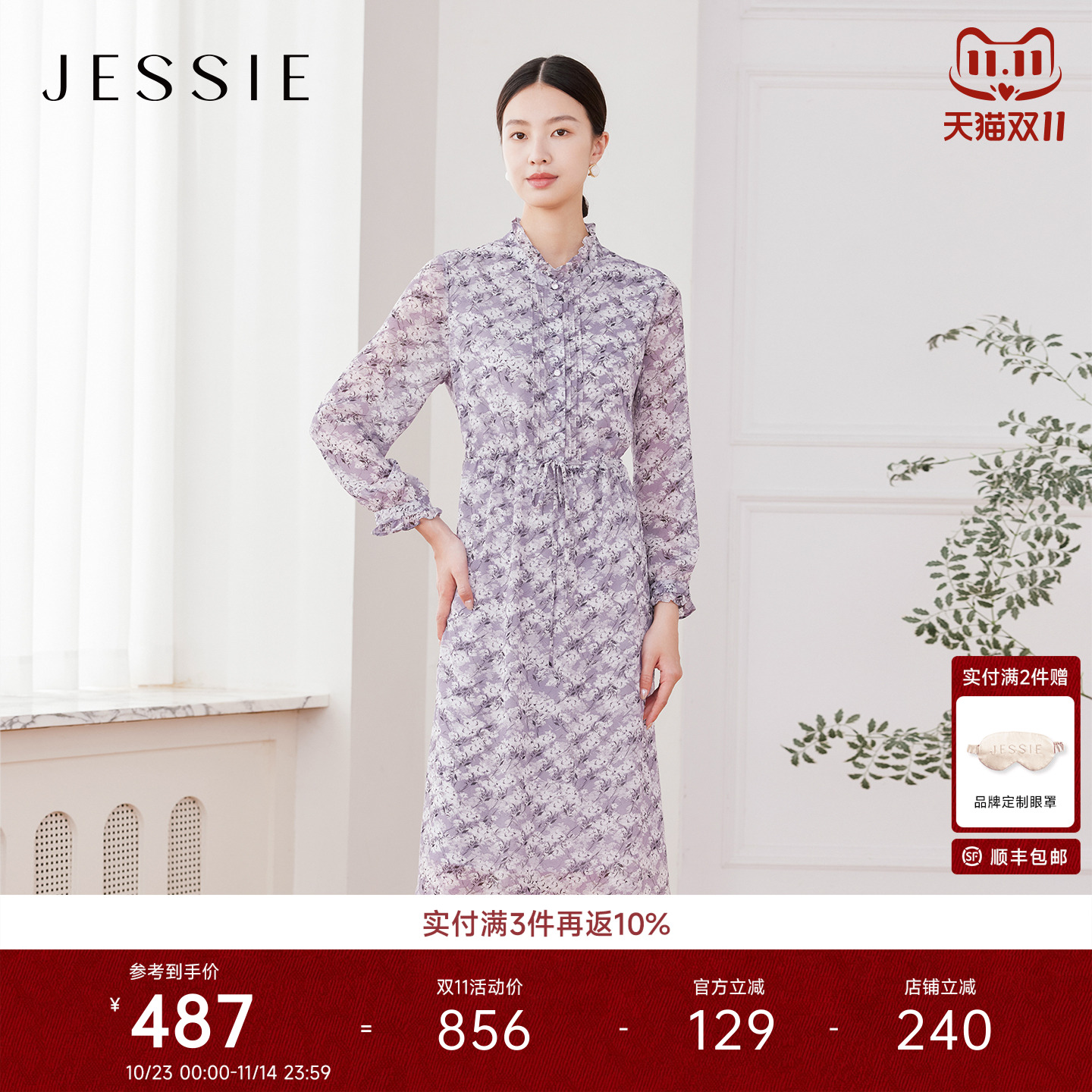 JESSIE25年秋季新款碎花雪纺连衣裙女木耳花边领长袖立领收腰显瘦