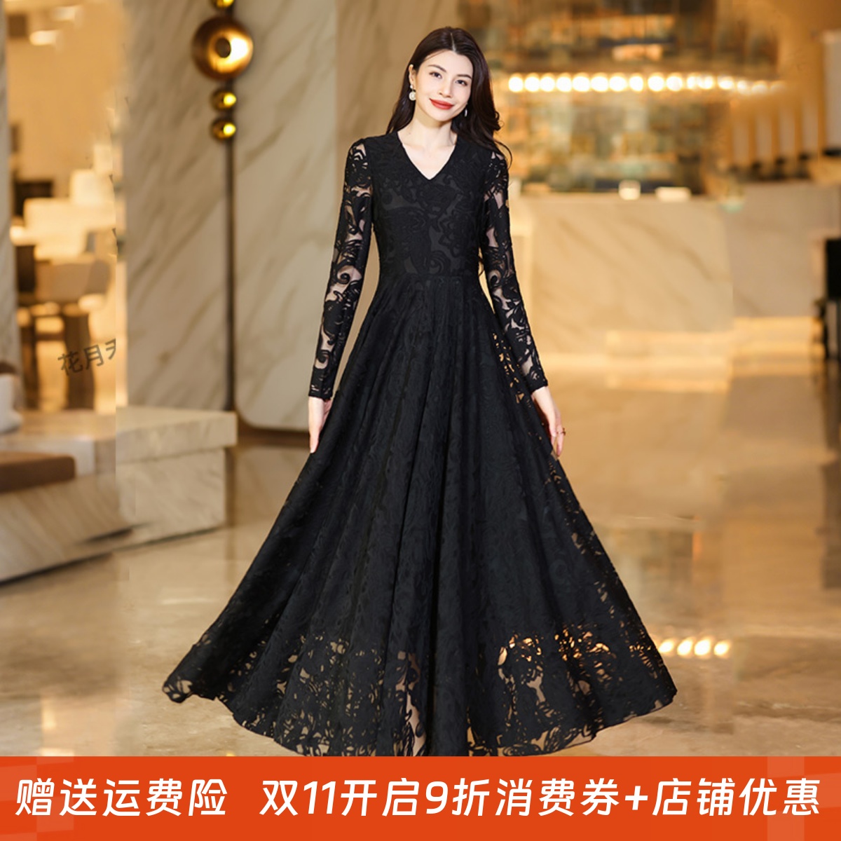 2025年新款春秋冬优雅气质长袖剪花大摆连衣裙长裙雪纺裙沙滩裙子