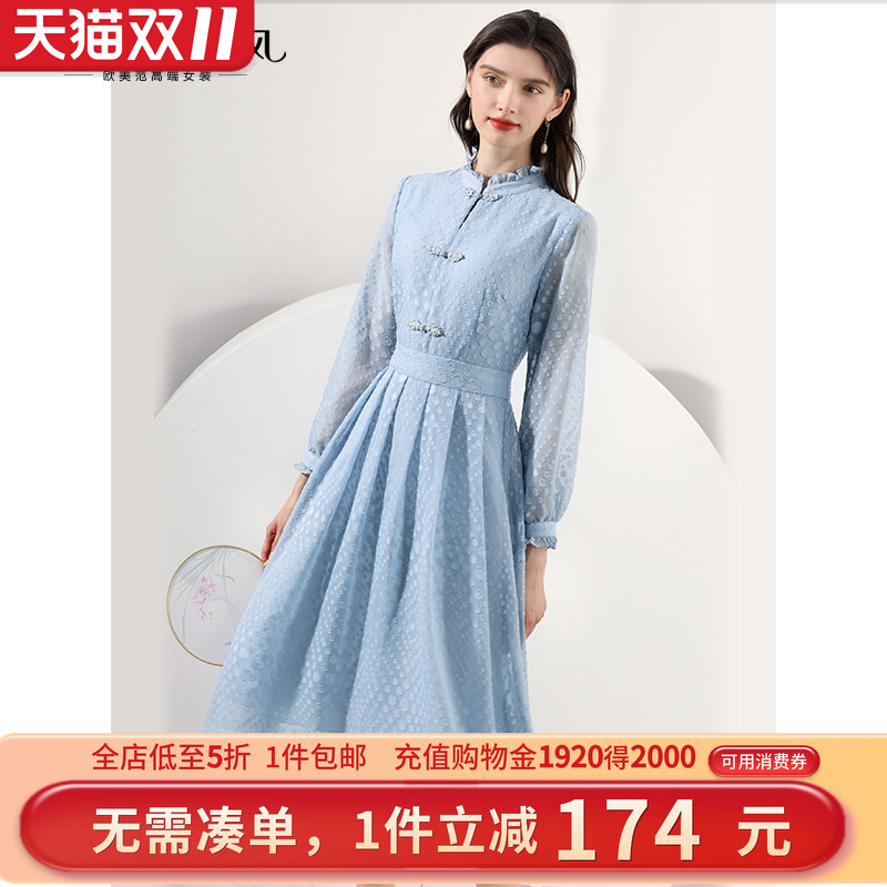未风蓝色雪纺连衣裙女秋2025年秋季新款女装减龄高腰显瘦长袖裙子