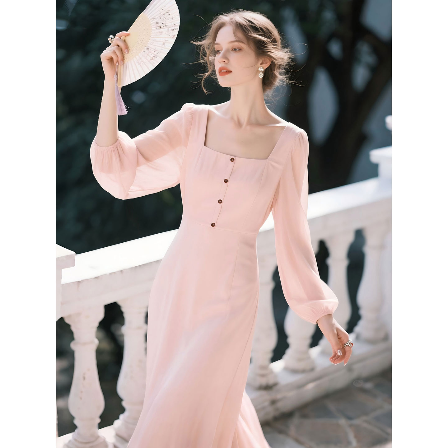 粉色方领雪纺长袖连衣裙女2025年秋季新款法式巨好看的早秋裙子