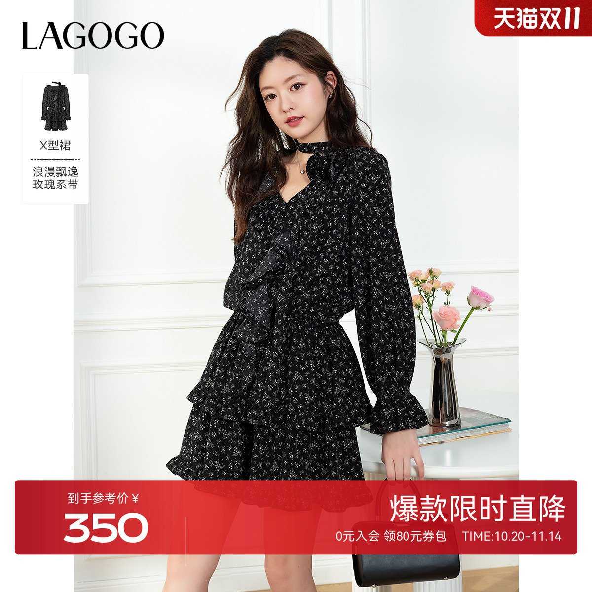 LAGOGO收腰显瘦碎花连衣裙女拉谷谷2025秋冬季新款长袖仙气雪纺裙