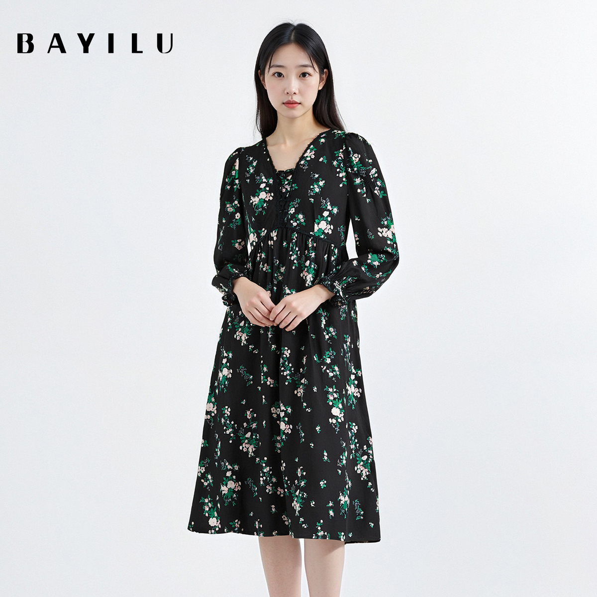 芭依璐2025秋冬新款连衣裙长袖碎花雪纺修身显瘦气质裙子收腰显瘦