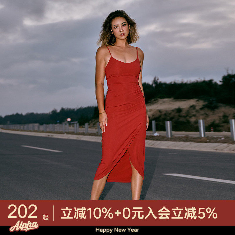 alphagym老友记带胸垫吊带连衣裙修身红色中长款瑞秋裙包臀裙子