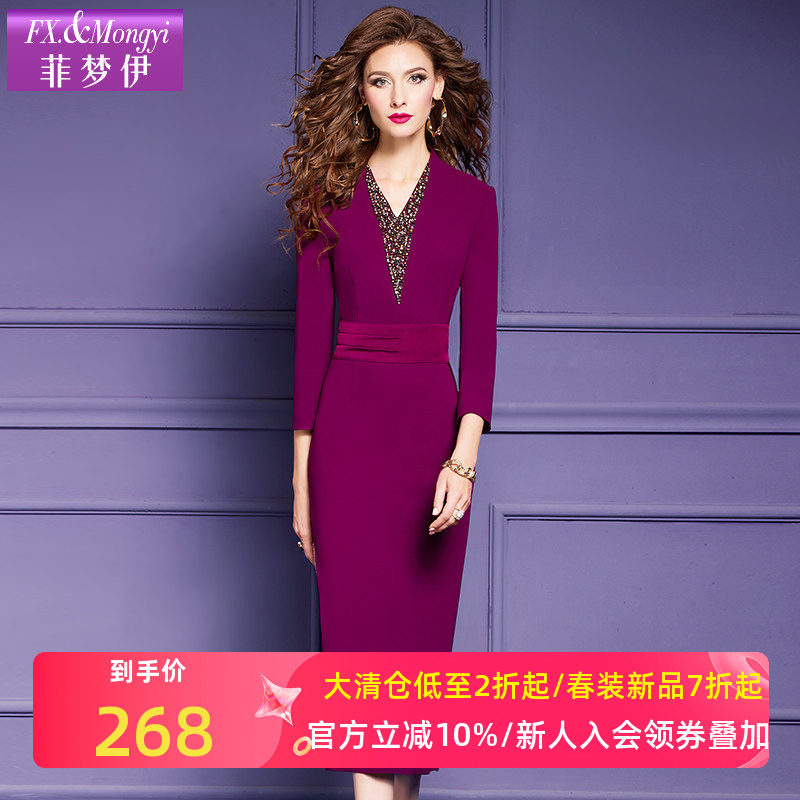 菲梦伊钉珠连衣裙女秋季新款轻熟高腰别致设计感开叉中长款包臀裙