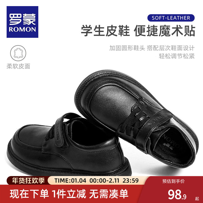 罗蒙男童皮鞋秋冬新款小学生校园男孩软底儿童黑色英伦风演出童鞋